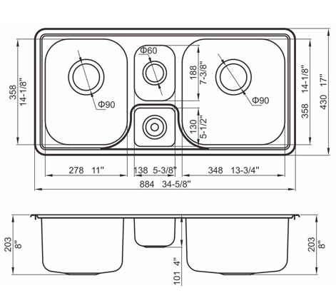 槽底采用斜面壓痕,四輻導流槽設計,與平面壓痕和無痕水槽相比,導水更為流暢,下水更迅速,能有效防止積水,消除沉淀物